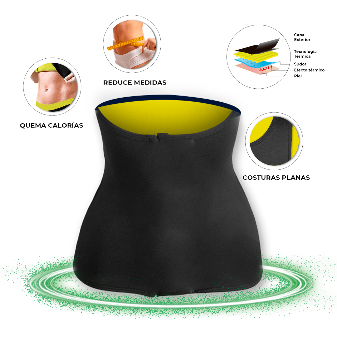 Su exclusiva tecnología y material de alta calidad produce mayor compresión del abdomen y la cintura, provocando asi una mayor sudoración, la cual ayuda a disminuir de medidas.
