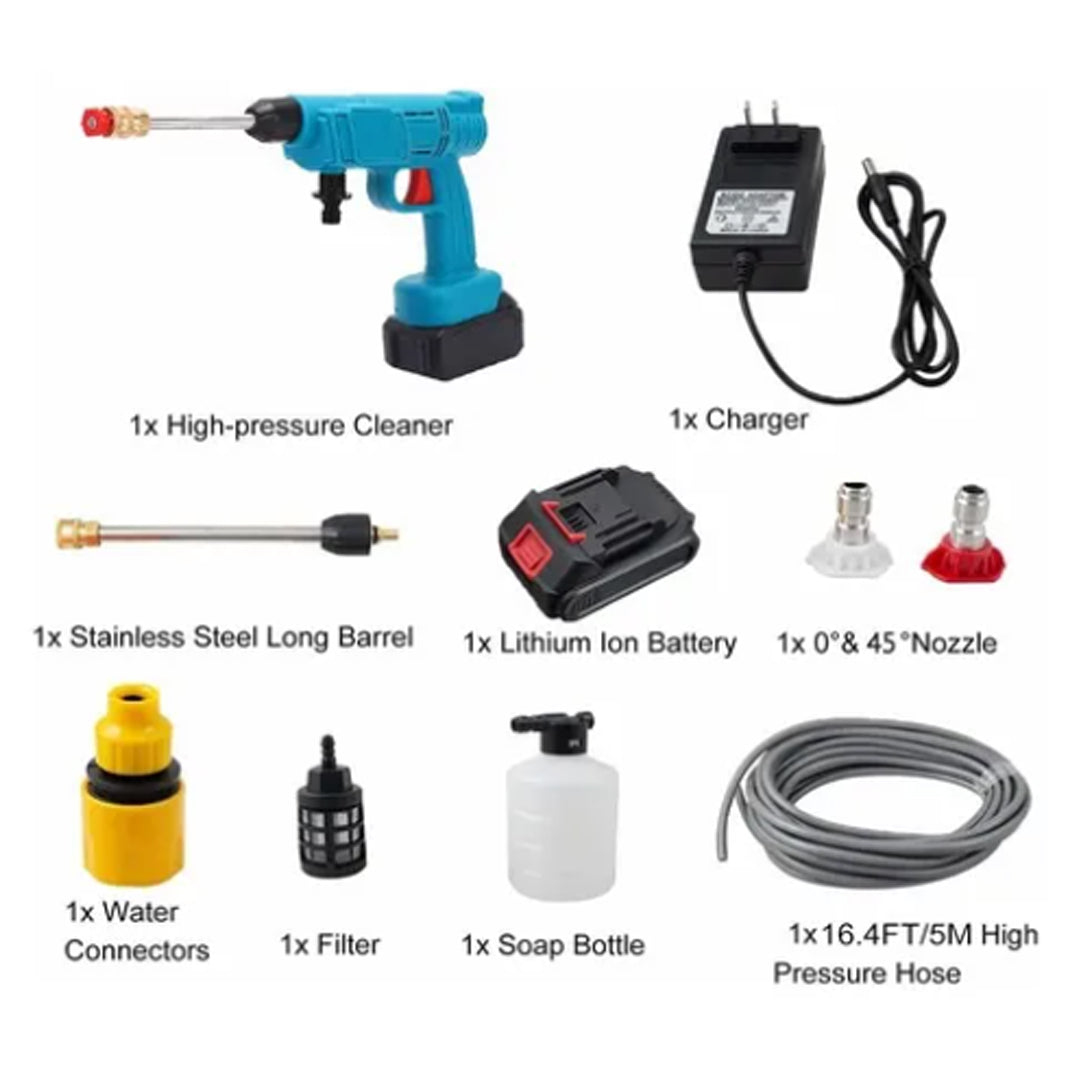 5. Accesorios completos --- 2 boquillas, 1 botella de jabón, 1 filtro, 1 batería, 1 cargador, 1 manguera de agua, también 1 conector de agua, ¡obtenga todo lo que necesita aquí!