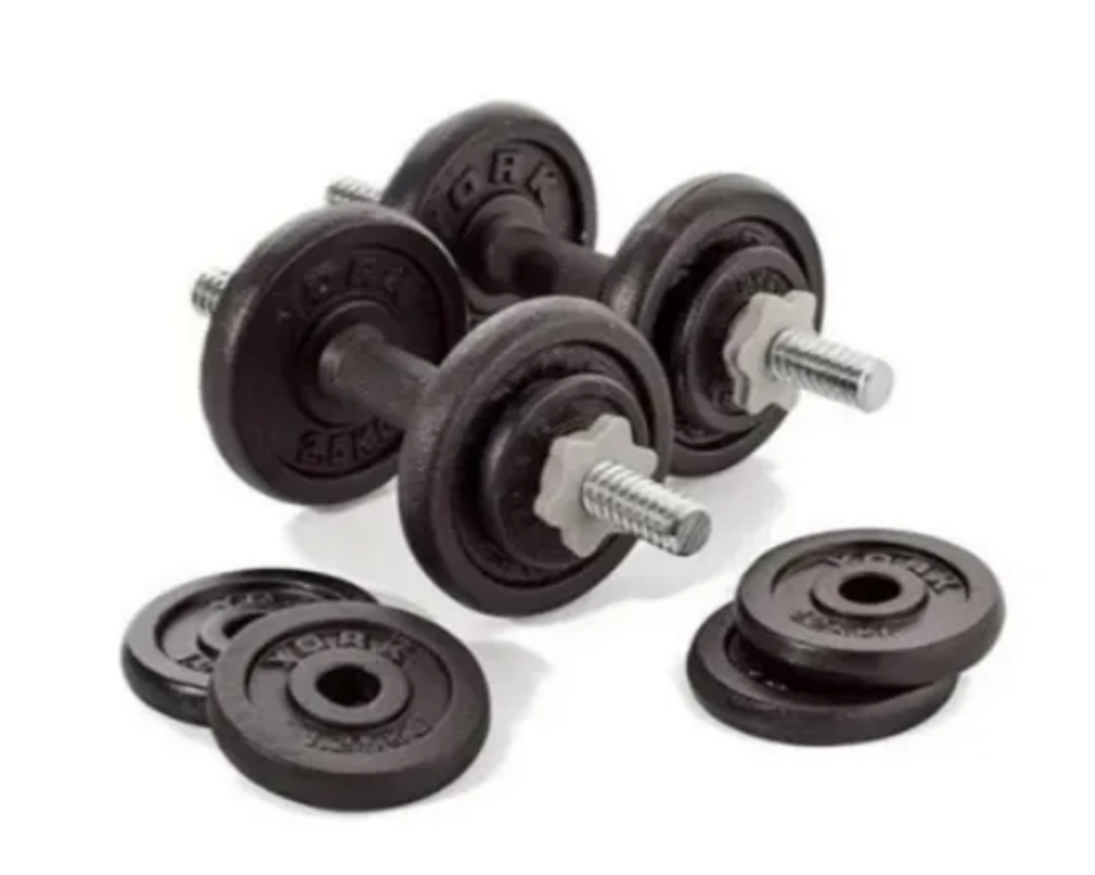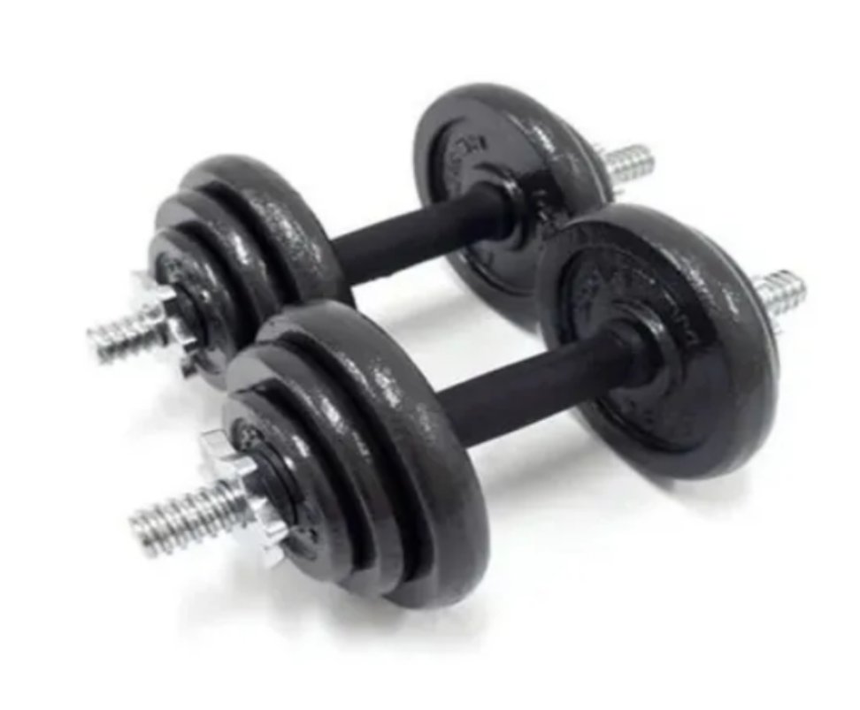 3). 12 discos de diferentes pesos (0.5, 1.25 y 2.5 kg).